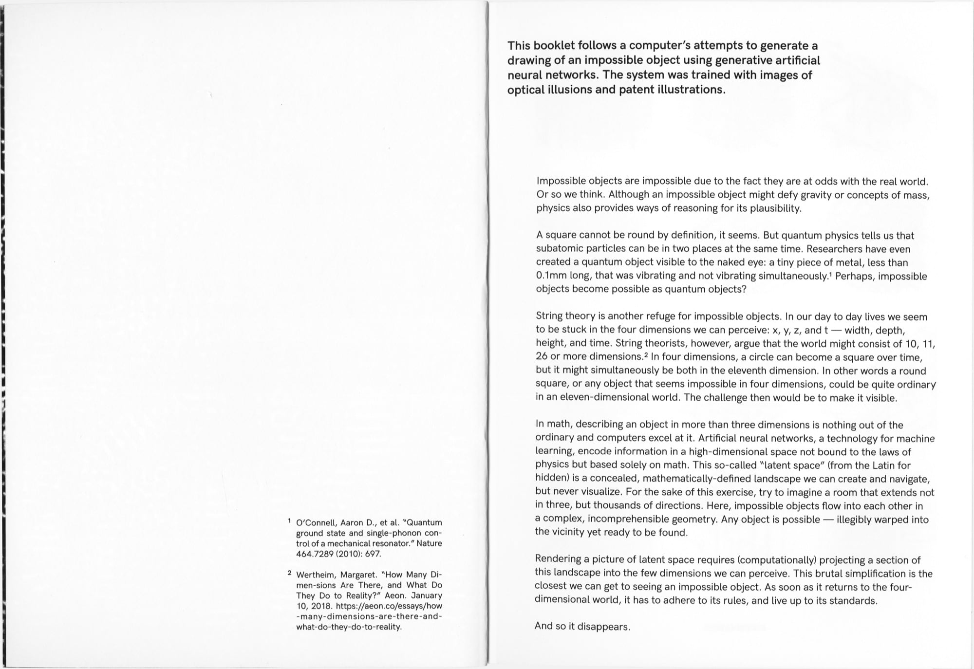 The piece offers an experience of the disconnect between what can be observed, reasoned with, communicated, and that which emerges from within artificial neural networks invisibly and un-imaginably: their “intelligence”. It asks to what extent the world can be modeled through mathematics, and conversely, whether we can understand these models. Can we understand what we cannot observe or imagine?