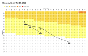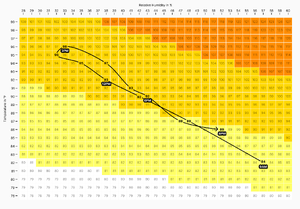 A two-dimensional data table with the axes temperature and humidity lists the heat index in each cell. Cells are color-coded based on a heat risk scale.